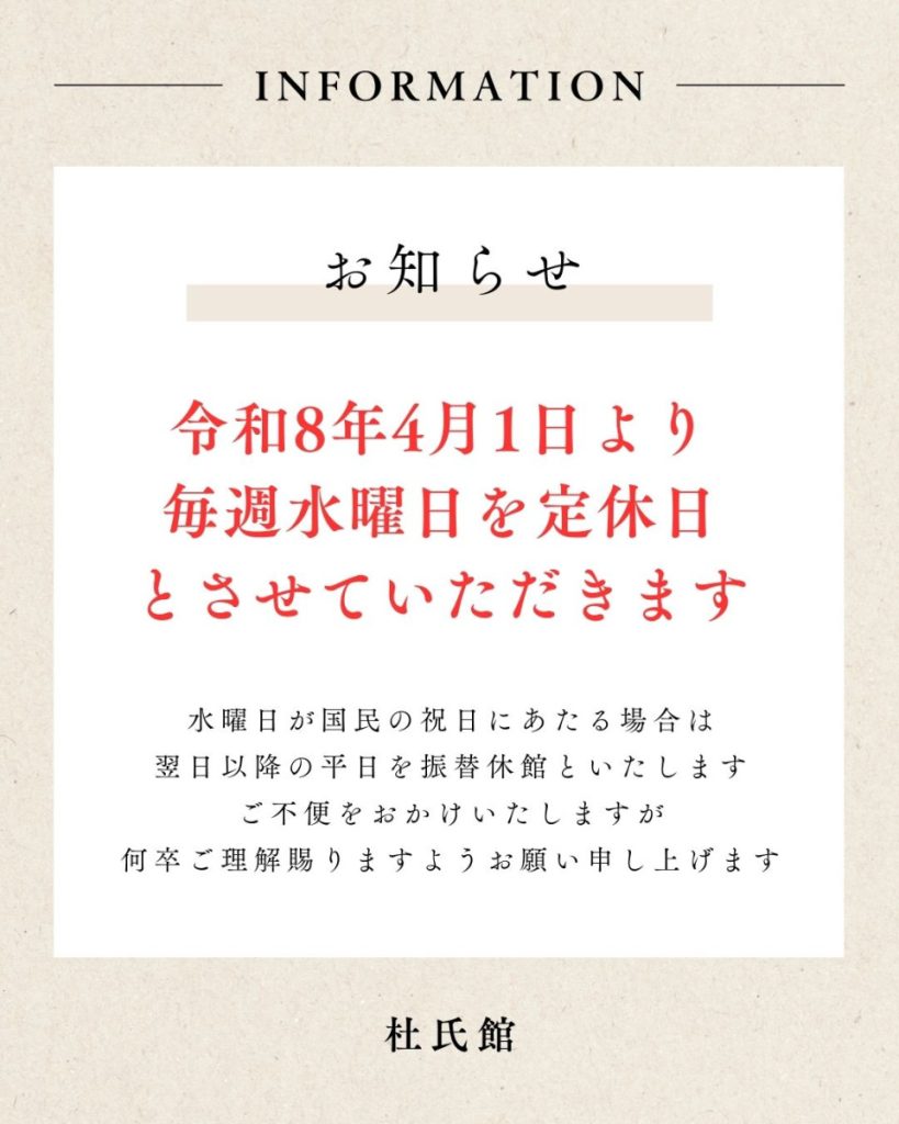 【杜氏館定休日のお知らせ】