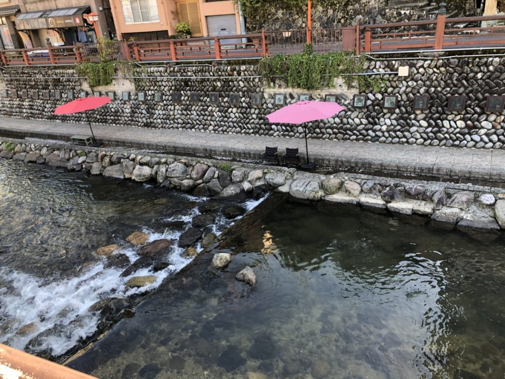 春来川のせせらぎと、湯けむりが立ちのぼる湯村温泉。 この度、親水域沿いに2基のパラソルを設置いたしました。