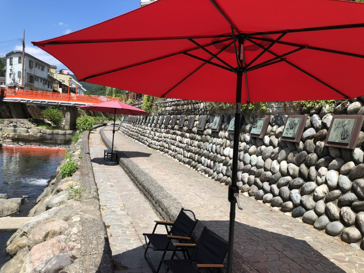 春来川のせせらぎと、湯けむりが立ちのぼる湯村温泉。 この度、親水域沿いに2基のパラソルを設置いたしました。